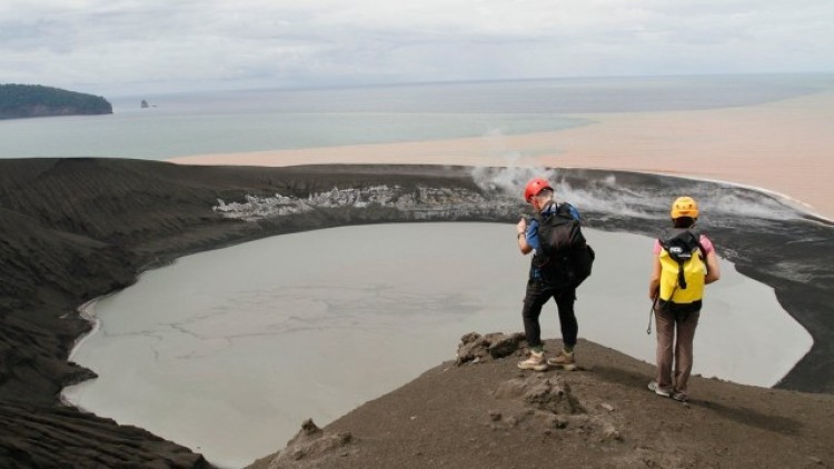 Tampak dua orang warga negara asing yang berfoto di dekat kawah Anak Krakatau yang kini terisi air. Ini merupakan bagian barat daya Anak Krakatau yang sekarang muncul lagi setelah hancur akibat longsor pada Desember lalu. Dia juga terlihat memotret air berwarna cokelat yang berada di sekitar Anak Krakatau.